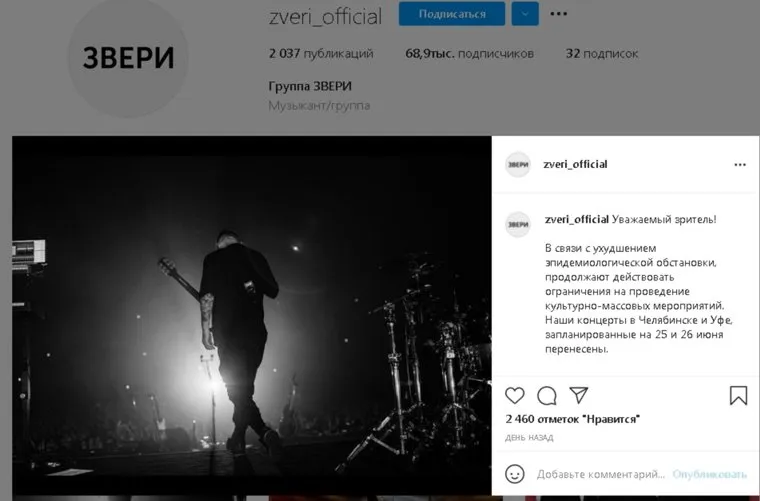 Концерт группы «Звери» в Челябинске, запланированный на 25 июня, не состоится из-за ухудшения ситуации с коронавирусом. Об этом сообщается на официальной странице коллектива в Instagram (деятельность запрещена в РФ).