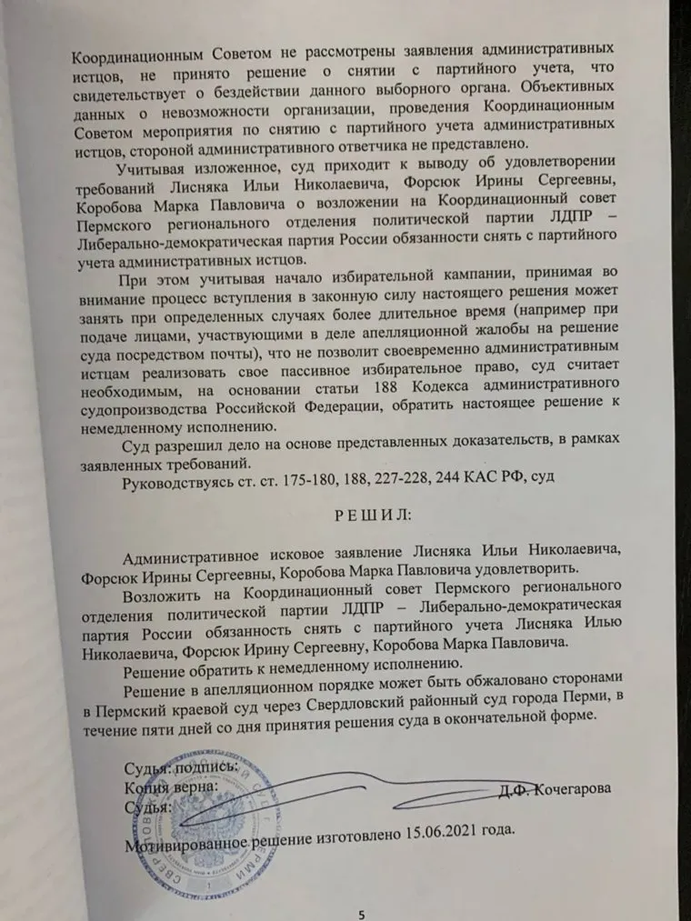 «Дата поступления: 22.06.2021. Вид жалобы: апелляционная жалоба. Заявитель: ответчик», — сказано в картотеке суда. Обжалуется решение от 9 июня. Там сказано, что реготделение должно немедленно исключить из партии депутата гордумы Перми Илью Лисняка, депутата думы Добрянки Марка Коробова и члена общественного совета при ГУ МВД России по региону Ирину Форсюк.