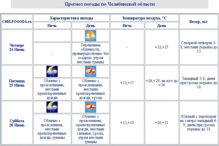 При этом все дни, согласно прогнозу челябинского ЦГМС, будут идти дожди. Также ожидаются грозы и туманы. Порывы ветра при грозах будут достигать 18 метров в секунду.