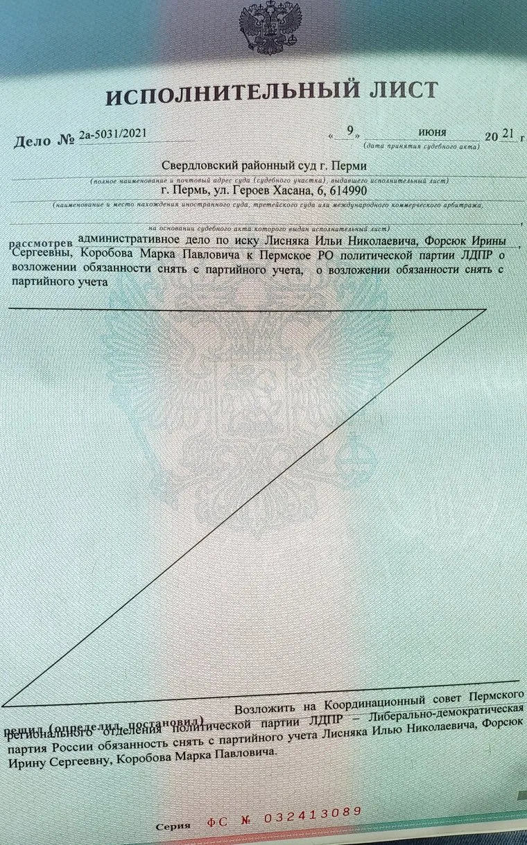 После обращения в СКР Лисняк, а также член общественного совета при ГУ МВД России по краю Ирина Форсюк и депутат думы Добрянки Марк Коробов получили в суде исполнительные листы. Несмотря на тот факт, что реготделение ЛДПР обжалует решение суда, документ подлежит немедленному исполнению, поскольку избирательная кампания и период выдвижения кандидатов уже стартовал. Исполнительные листы переданы службе судебных приставов. Связаться с Постниковым не удалось — он не ответил на звонок URA.RU и на вопросы в мессенджере.