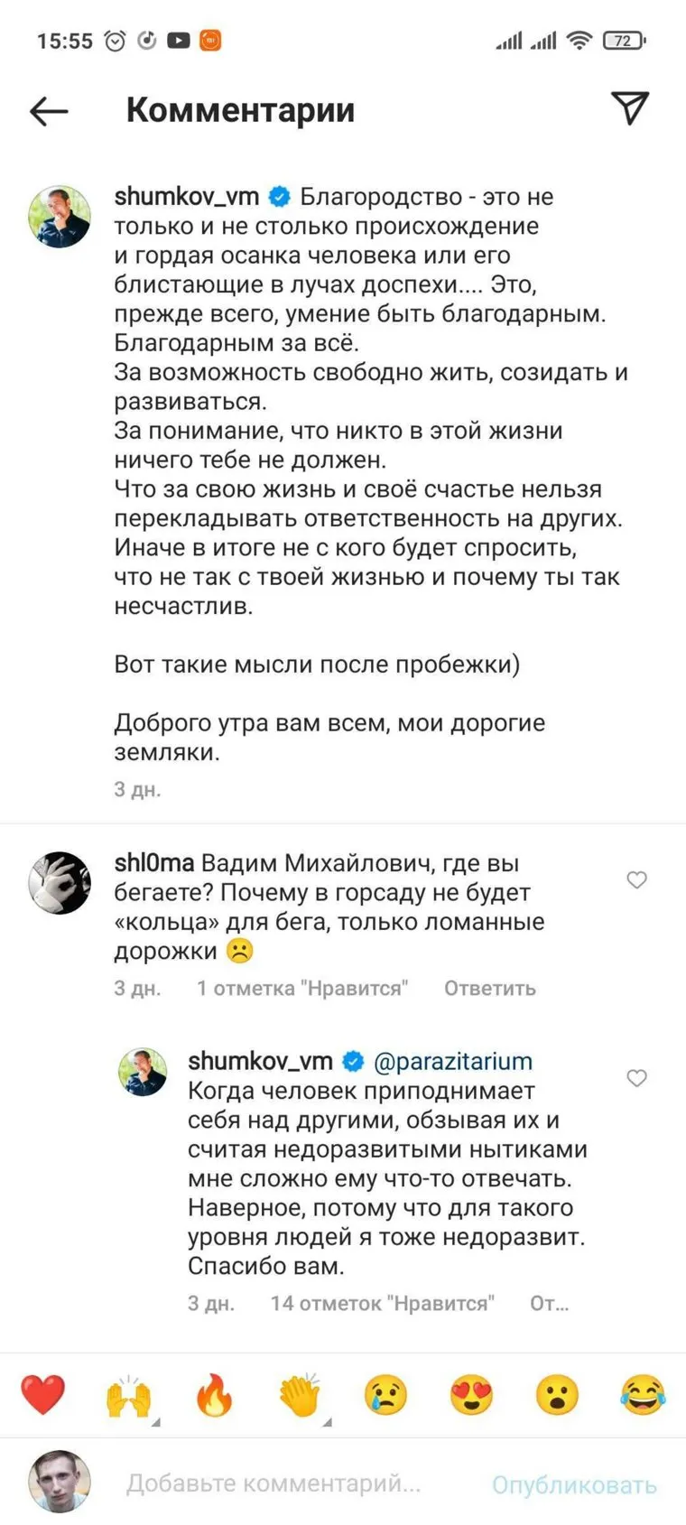 «Когда человек приподнимает себя над другими, обзывая их и считая недоразвитыми нытиками, мне сложно ему что-то отвечать. Наверное, потому что для такого уровня людей я тоже недоразвит», — объяснил Шумков пользователю parazitarium. На момент написания новости URA.RU не удалось найти комментарий, на который ответил губернатор.