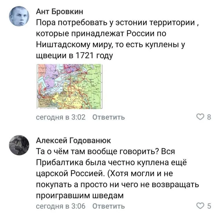 Другие россияне напомнили об исторических событиях. Таким образом, по их мнению, это Эстония должна вернуть свои земли в состав РФ.