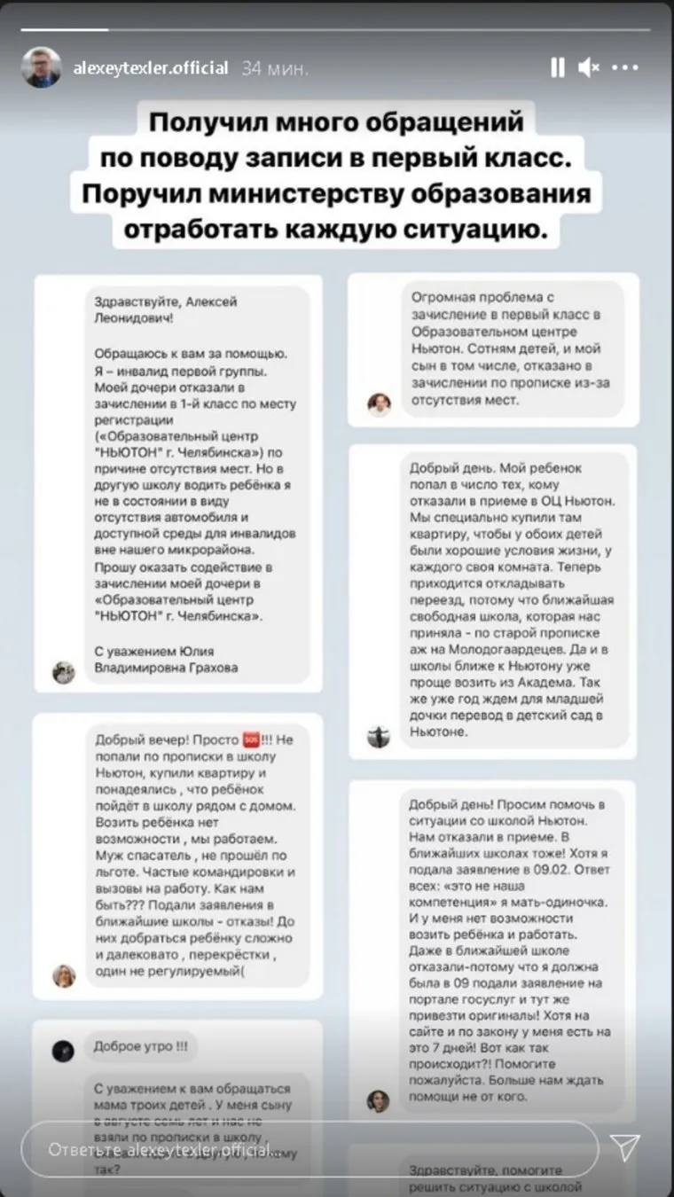 «Получил много обращений по поводу записи в первый класс. Поручил министерству образования отработать каждую ситуацию», — написал Текслер 7 июля в официальном Instagram (деятельность запрещена в РФ)-аккаунте. Свой пост он сопроводил скриншотами обращений горожан.