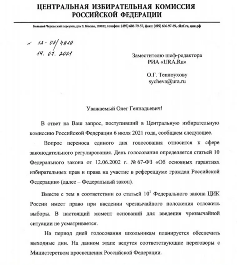 «На период дней голосования школьникам планируется обеспечить выходные дни. На данном этапе ведутся соответствующие переговоры с Министерством просвещения РФ», — говорится в документе, направленном ЦИК в редакцию.