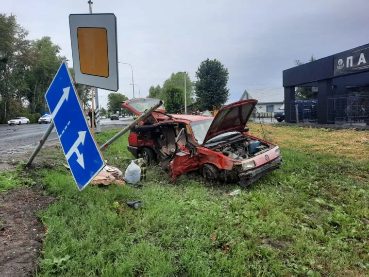 После столкновения автомобиль Volkswagen отбросило на дорожный знак