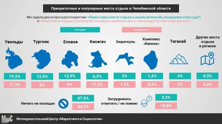 Из числа опрошенных 19,3% выезжали в этом году на Увильды. На втором месте по посещаемости оказались озера Тургояк и Еловое, по 12,5%. На озере Кисегач побывали 6,3% опрошенных. В список объектов внутреннего туризма включили и озеро Банное, которое хоть и находится территориально на территории Башкортостана, но здесь много отдыхающих из Челябинской области. На этом водоеме побывали 1,3% респондентов. 4% опрошенных посетили в этом году национальный парк «Таганай», который находится возле Златоуста.