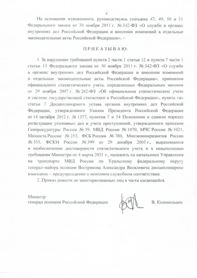 Разнос по итогам первых трех месяцев 2021 года Колокольцев устроил на коллегии МВД 29 мая, но порочная практика фальсификации продолжилась и во втором квартале. В связи с этим в Екатеринбург решено было отправить инспекцию.