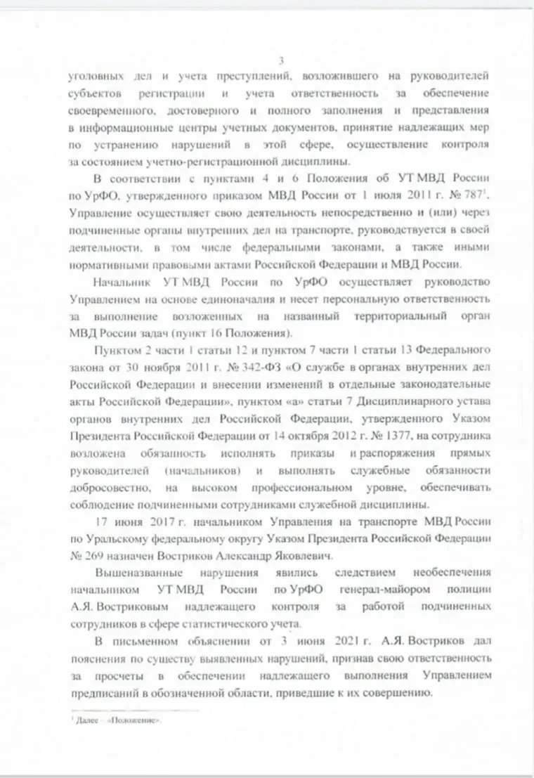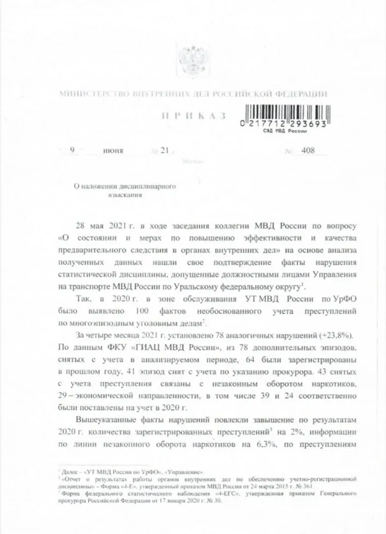 «По итогам первого квартала 2021 года МВД провело анализ материалов уральского управления на транспорте и выявило факты фальсификации. Например, общая масса наркотиков, изъятая у одного задержанного делилась на части, что давало основание фиксировать каждую часть изъятого как отдельно раскрытое преступление. Это улучшало статистику раскрываемости, но лишь формально. Кроме того, транспортные полицейские в нарушении инструкции приписывали себе раскрытие преступлений вне линейных объектов», — говорит инсайдер.