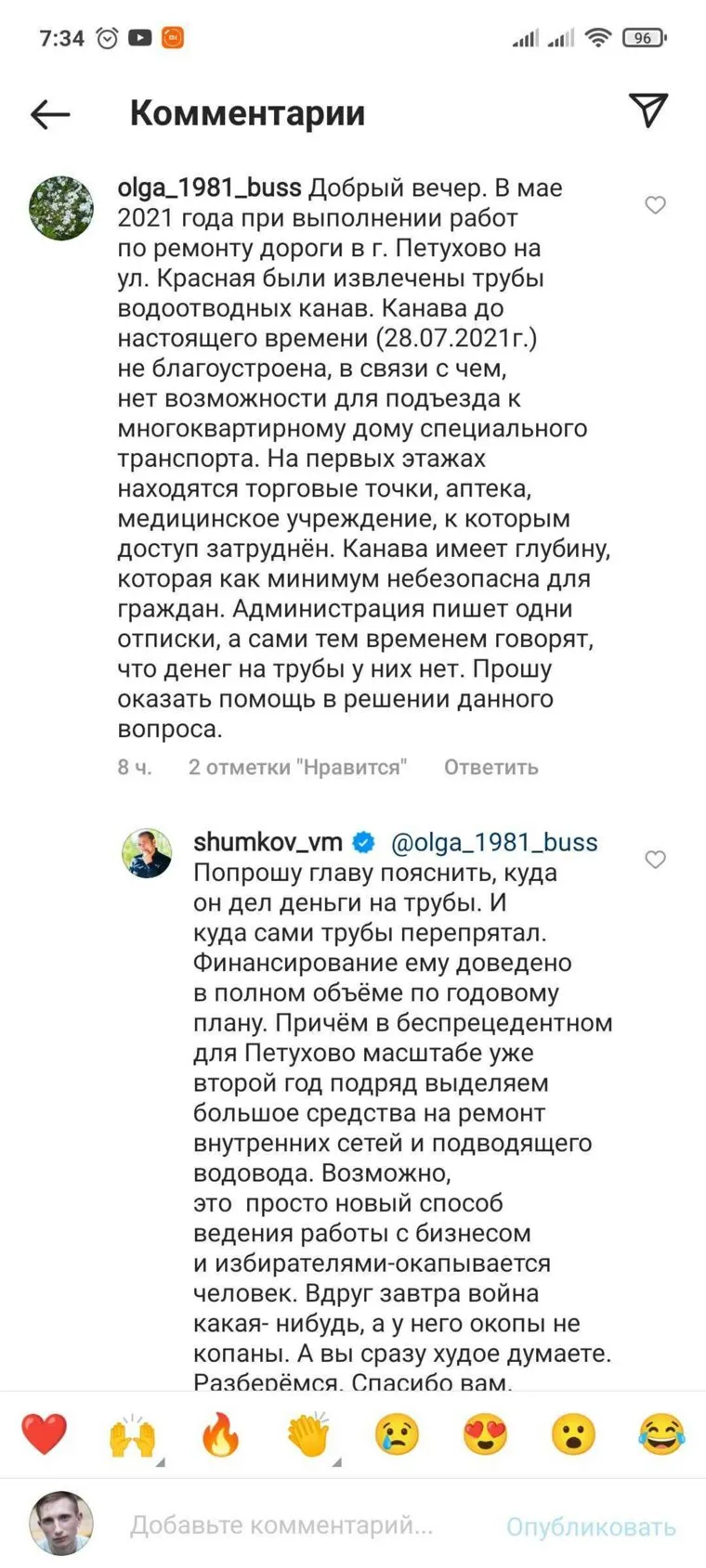 Губернатор Курганской области Вадим Шумков в шутку предположил, что глава города Петухова Александр Гудков делает для себя окопы. Так он ответил в своем instagram (деятельность запрещена в РФ)-аккаунте на жалобу, связанную с неблагоустроенными водоотводными канавами в городе, которые усложняют жизнь петуховцам.