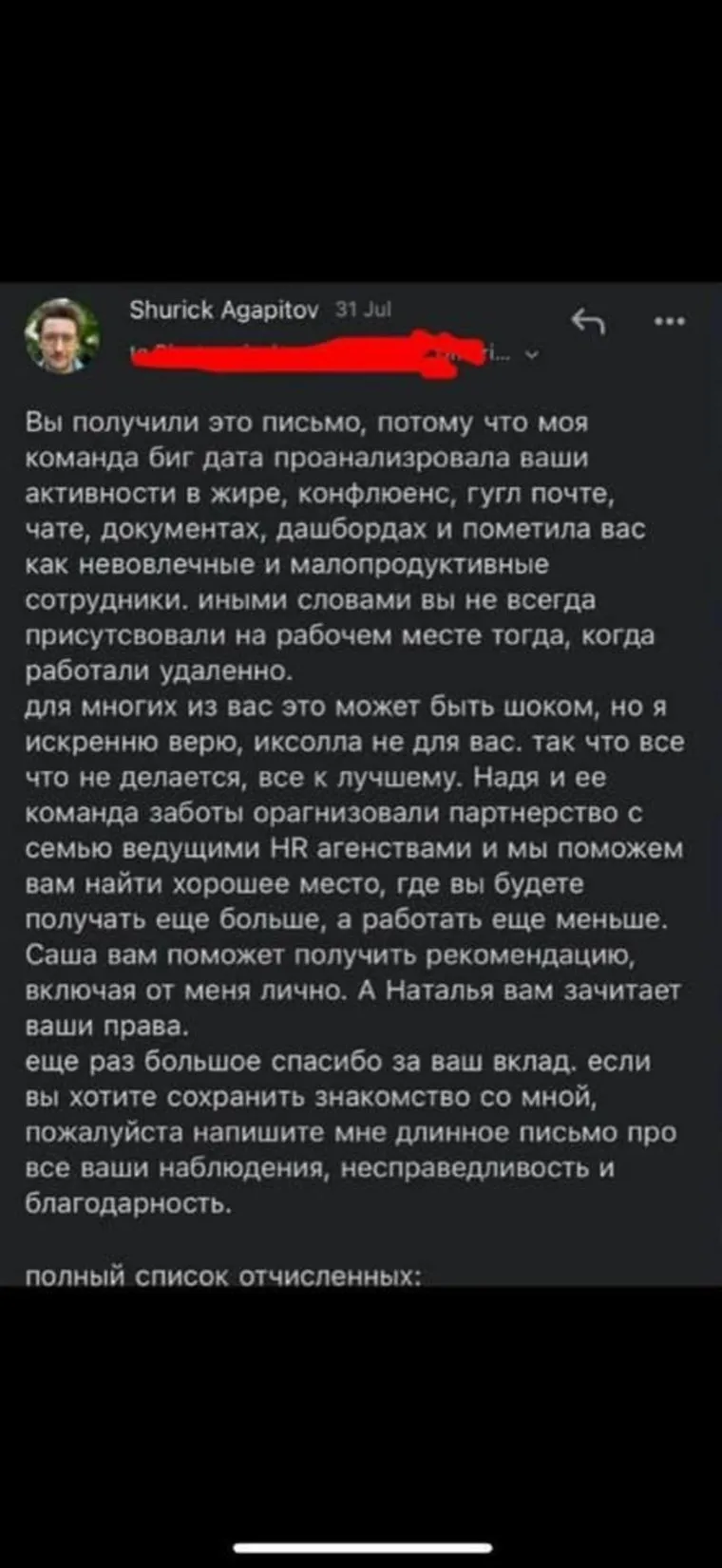 «Вы получили это письмо, потому что моя команда Big Data проанализировала ваши активности в Jira, Confluence, Google почте, чате, документах, дашбордах и пометила вас как невовлеченных и малопродуктивных. Иными словами, вы не всегда присутствовали на рабочем месте тогда, когда работали удаленно», — написал сотрудникам основатель и директор Xsolla, миллиардер Александр Агапитов, скрин письма которого опубликован Владимирской.