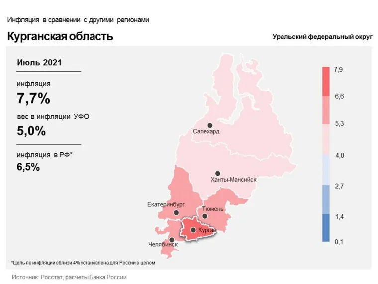 «Годовая инфляция в Курганской области в июле ускорилась до 7,67%, оставаясь выше, чем в Уральском федеральном округе (5,67%) и по России в целом (6,46%). Увеличение инфляции в регионе происходило под влиянием общефедеральных факторов. Факторы ускорения регионального характера связаны с более низким уровнем конкуренции, чем в целом по стране, что при оживлении спроса обусловило более сильный рост цен на отдельные непродовольственные товары», — говорится в информационно-аналитическом комментарии.