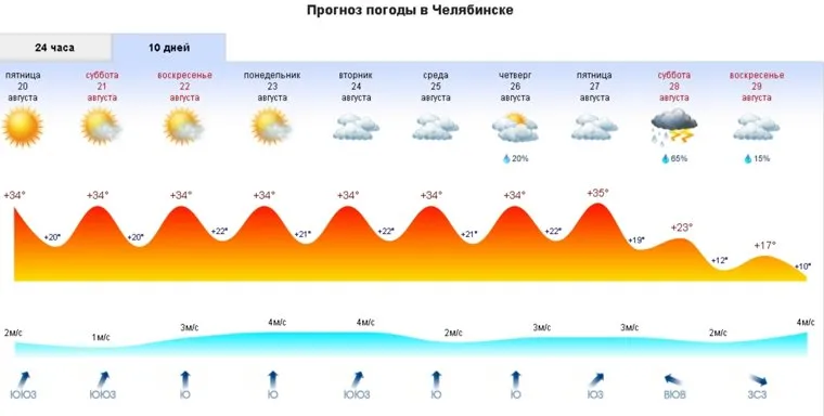 По данным синоптиков Realmeteo жара отступит лишь в следующую субботу. Дожди и грозы 28 августа принесут на Южный Урал похолодание до 23 градусов. В воскресенье, 29 августа, в Челябинской области похолодает уже до 17 градусов.