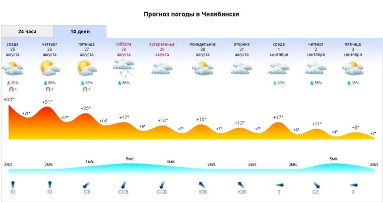 Самым теплым днем последующей рабочей недели станет 1 сентября: праздновать День знаний челябинцы будут при 17 градусах. Самым холодным окажется 3 сентября, когда днем синоптики прогнозируют всего 8 градусов тепла.