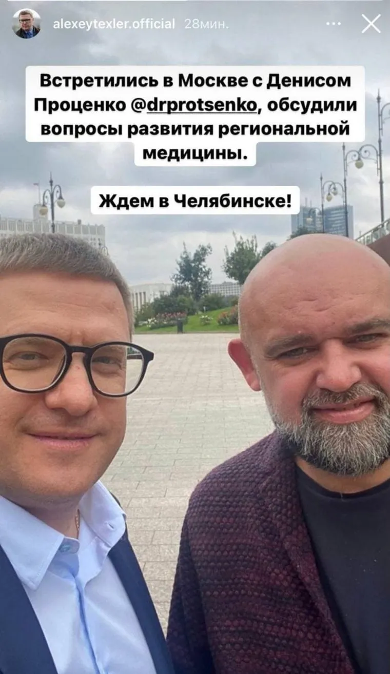 «Встретились в Москве с Денисом Проценко. Обсудили вопрос развития региональной медицины. Ждем в Челябинске!», — написал Текслер, выложив фото с Проценко.