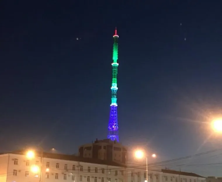 Телевизионная вышка в Якутске поочередно окрасилась цветами флага Тюменской области — белым, синим, зеленым, красным