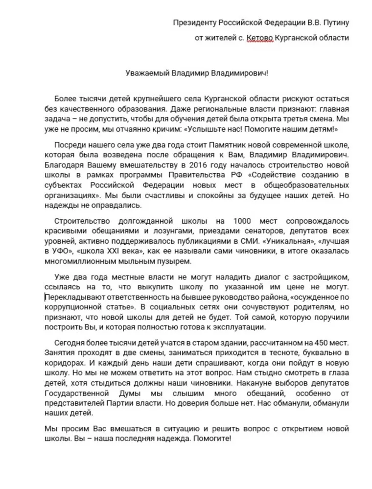 Почти 800 человек — жителей села Кетово подписали обращение к президенту Владимиру Путину по поводу новой школы. Учреждение не запустили к 1 сентября, так как власти и инвестор не могут договориться о цене выкупа школы, что вылилось в скандал. Текст обращения URA.RU предоставили родители кетовских школьников.
