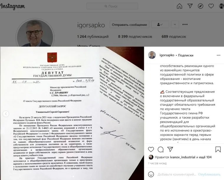«Предложения о включении в образовательный стандарт обязательного требования по изучению текста гимна РФ учащимися, а также разработки рекомендаций для общеобразовательных организаций по его исполнению в оркестрово-хоровом варианте перед первым уроком в день начала нового учебного года направил в адрес Минпросвещения РФ», — написал Сапко.
