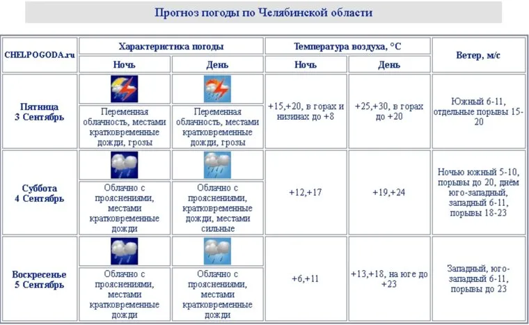 «Кратковременные дожди и грозы начнутся в ночь на пятницу и продолжатся днем. Порывы ветра будут достигать 20 метров в секунду, температура воздуха — 20 градусов. При этом в самом Челябинске осадков 3 сентября не ожидается», — пояснили URA.RU в региональном ЦГМС.