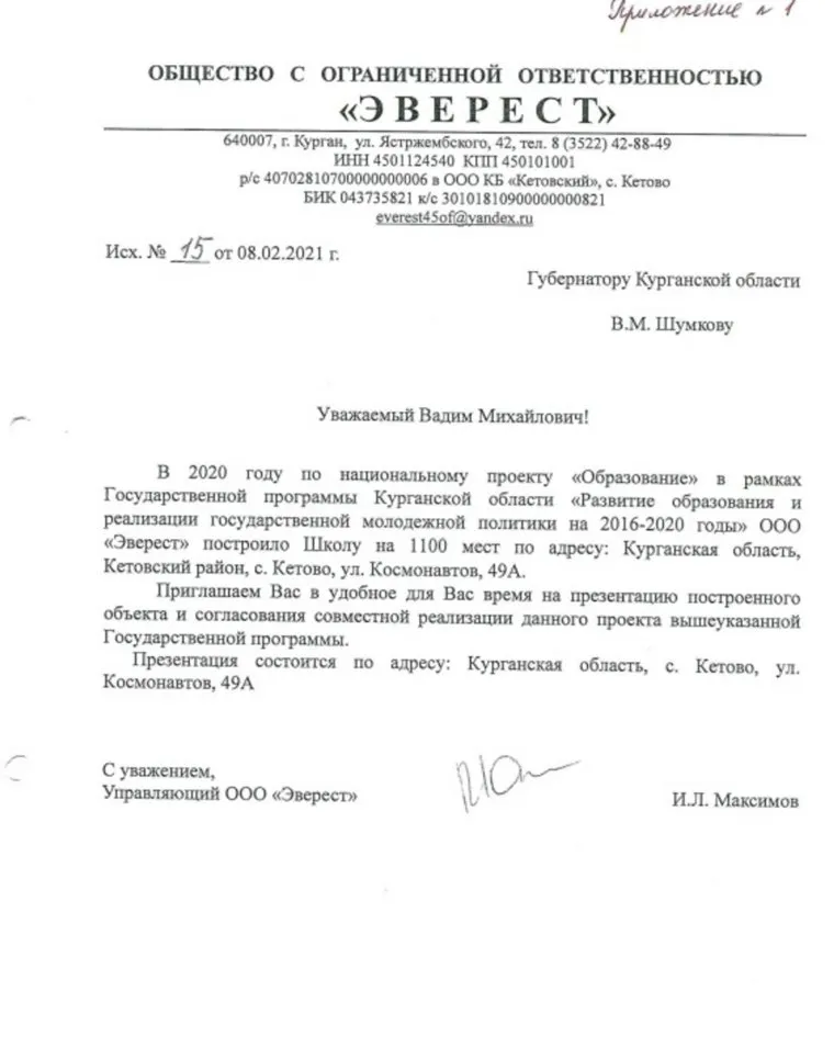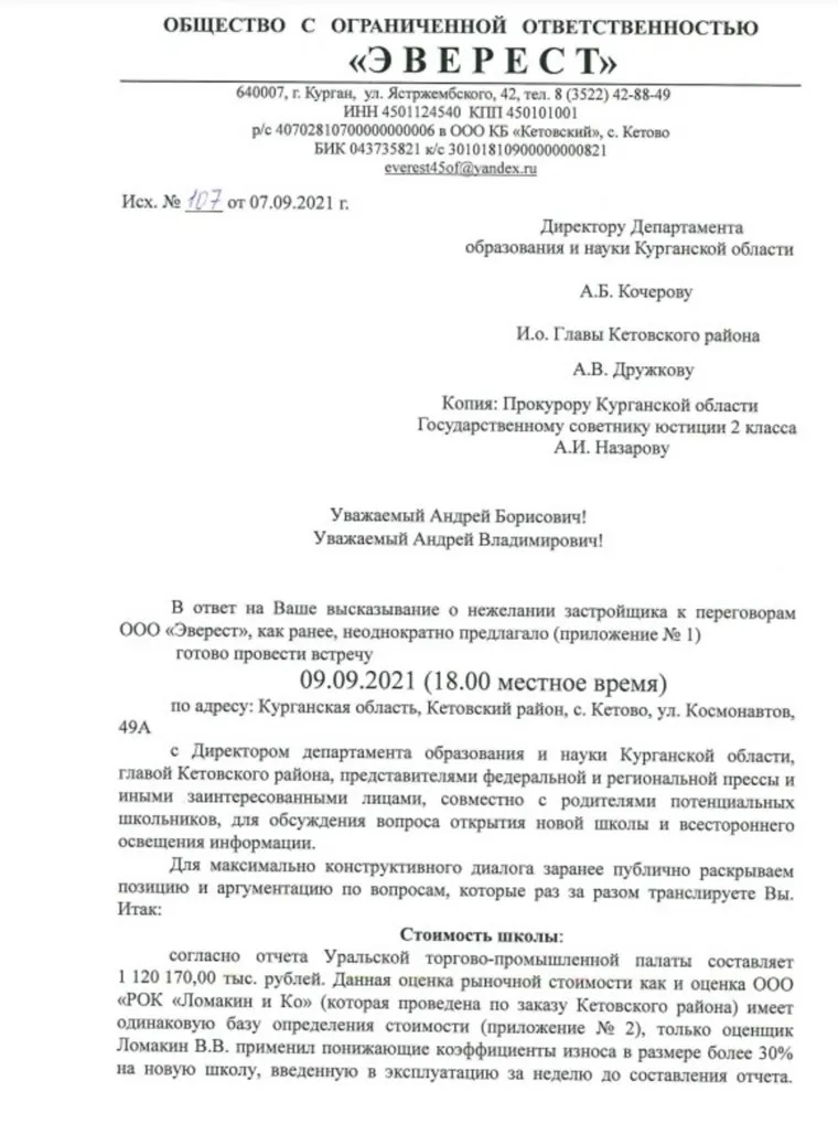 Приглашение на встречу в новой школе адресовано директору департамента образования Андрею Кочерову, и. о. главы Кетовского района Андрею Дружкову. «В ответ на ваше высказывание о нежелании застройщика к переговорам ООО „Эверест“ готово провести встречу 9 сентября для обсуждения вопроса открытия новой школы», — сказано в обращении.