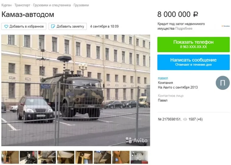 «Военного производства. 2013 года выпуска. Пробег 12 000 км. Привод 4 на 4. Дизель. Оснащен двумя независимыми печками, спутниковым ТВ, кондиционером, газовой плитой, холодильником, сейфом под оружие, телевизором с домашним кинотеатром. Рассчитан на семь спальных мест», — говорится в объявлении о продаже КамАЗа-автодома стоимостью 8 млн рублей. Внутри также расположен бак для воды на 230 л, бойлер для горячей воды. При этом туалетов нет, душ на улице.