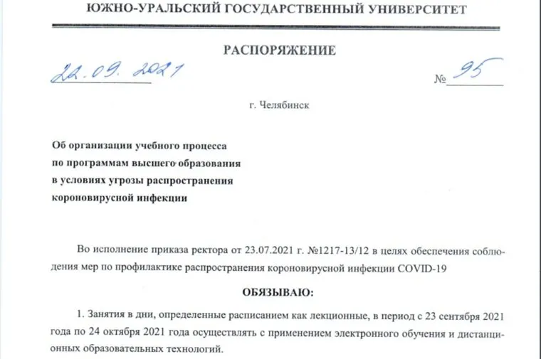 «Занятия в дни, определенные расписанием как лекционные, с период 23 сентября 2021 года по 24 октября 2021 года осуществлять с применением электронного обучения и дистанционных образовательных технологий. Директоров институтов и высших школ в срок до 23.09.2021 года довести до студентов и профессорско-преподавательского состава дни, определенные расписанием как лекционные», — говорится в документе, подписанном ректором Александром Шестаковым 22 сентября.