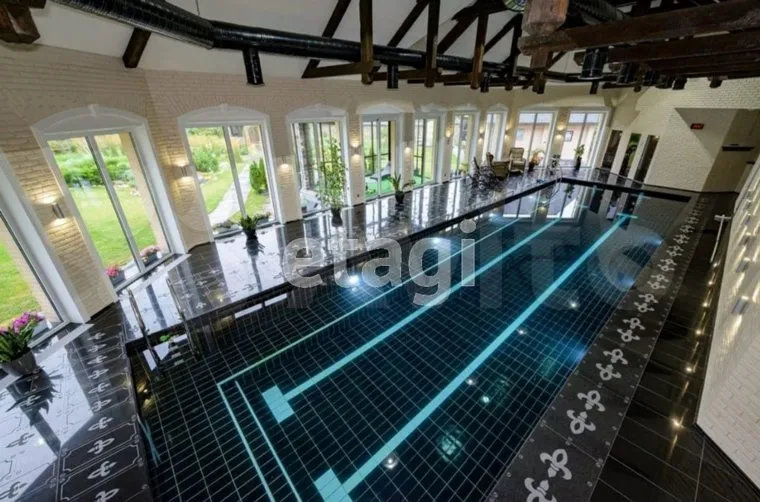 На участке расположены двухэтажный коттедж, дом для работников, летняя кухня с мангальной зоной. «На первом этаже расположились кухня, просторная гостиная с камином, спальня и кабинет. На втором этаже три спальни, барная зона, йога-студия и три санузла. Также в доме имеется круглогодичный, отапливаемый бассейн 16×5 м и глубиной два метра с русской баней на дровах, турецкий хаммам», — сказано в карточке товара.
