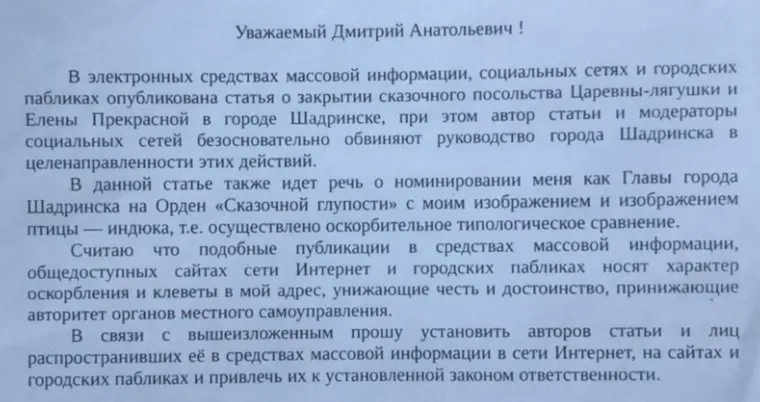«Прошу установить авторов статьи и лиц, распространивших ее в средствах массовой информации в сети, на сайтах и городских пабликах. И привлечь их к установленной законом ответственности», — говорится в заявлении мэра Шадринска в полицию.