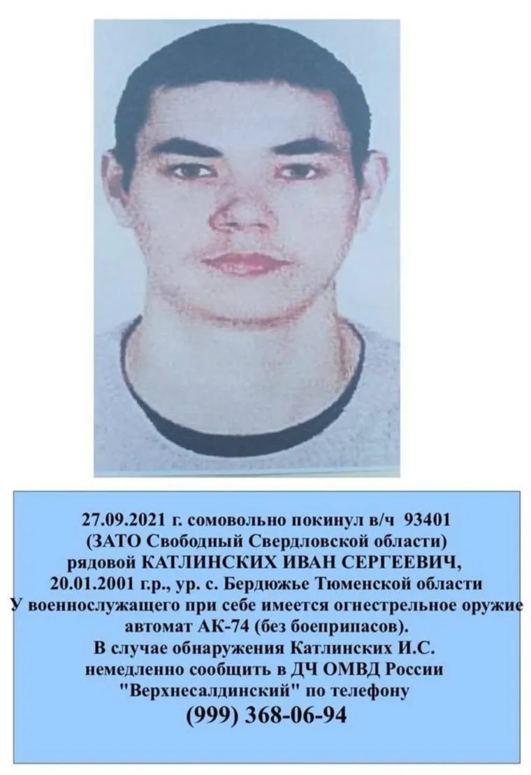 «Рядовой Катлинских Иван Сергеевич самовольно покинул воинскую часть №93401», — говорится в ориентировке. Автомат, который он вынес из воинской части был без боеприпасов.