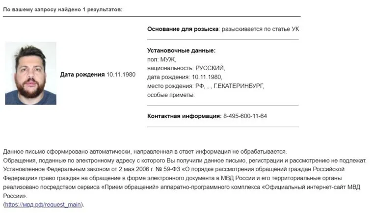 «Волков Леонид Михайлович. Основание для розыска: разыскивается по статье УК», — указано на сайте ведомства.