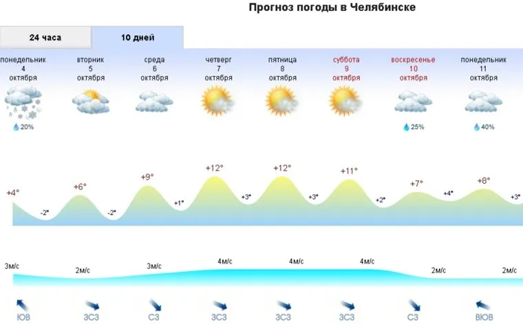 Дожди и мокрый снег закончатся в Челябинской области в понедельник. С 5 октября воздух начнет прогреваться — столбик термометра поднимется до 6 градусов. В последующие дни — 6, 7, 8 и 9 октября — температура будет расти. На пике подъема она достигнет 12 градусов.