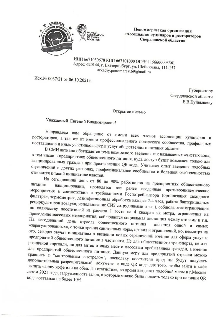 Свердловские рестораторы обратились с открытым письмом к губернатору Евгению Куйвашеву с просьбой пересмотреть решение о включении предприятий питания в число «чистых зон», вход в которые будет возможен только при наличии QR-кода о вакцинации. Авторы письма опасаются, что подобная ограничительная мера может привести к полному банкротству большого количества заведений, которые не восстановились после прошлогоднего локдауна.