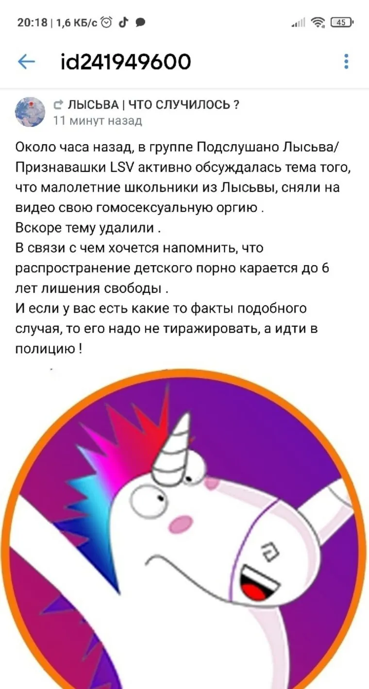 «В одной из лысьвенских групп в соцсетях, в закрытой беседе, где в основном состоят подростки, распространили видео, как парни, самому маленькому, наверное, 7 или 8 лет, а другим примерно по 12 лет, насилует один другого по обоюдному согласию. И подпись к видео „Обратите внимание, что все происходит у школы“. И это просто ужас», — подчеркнул житель Лысьвы.