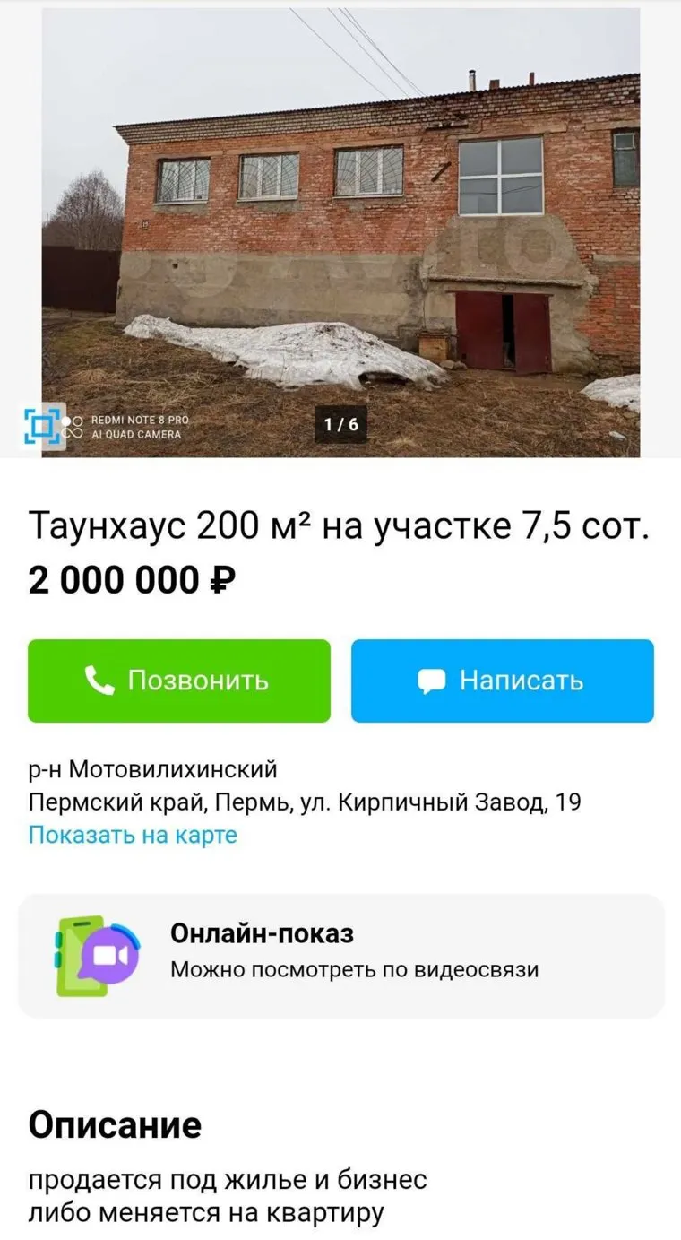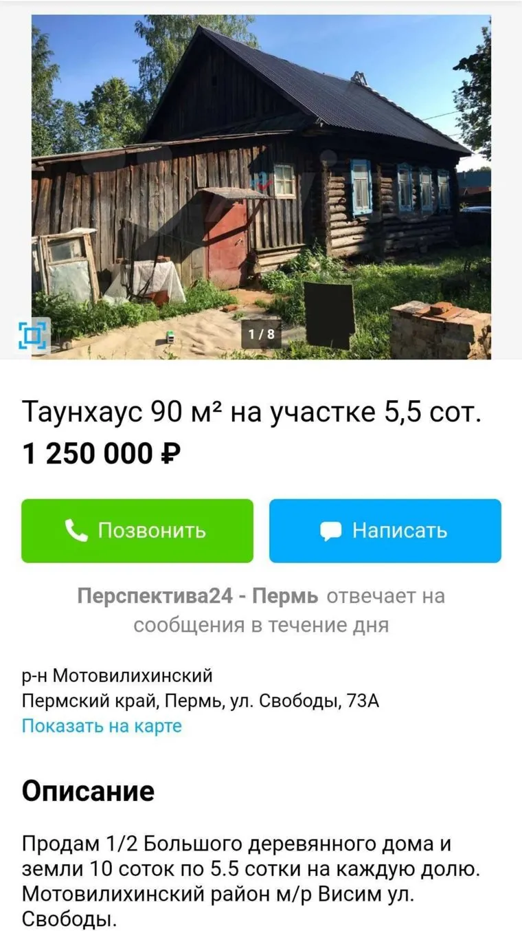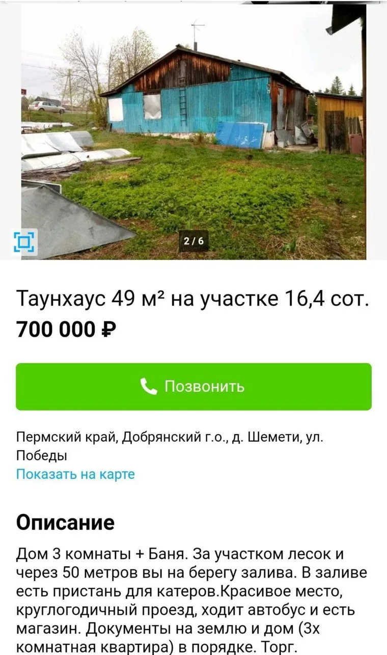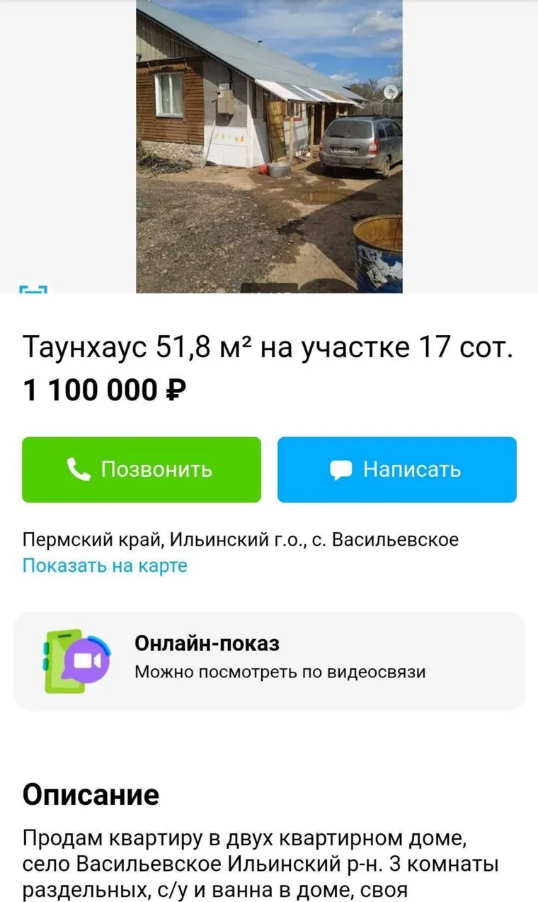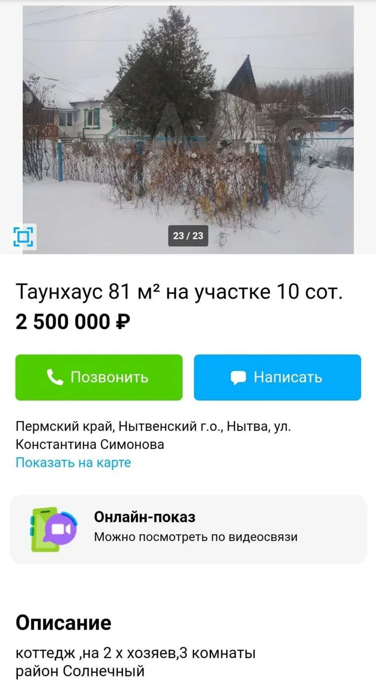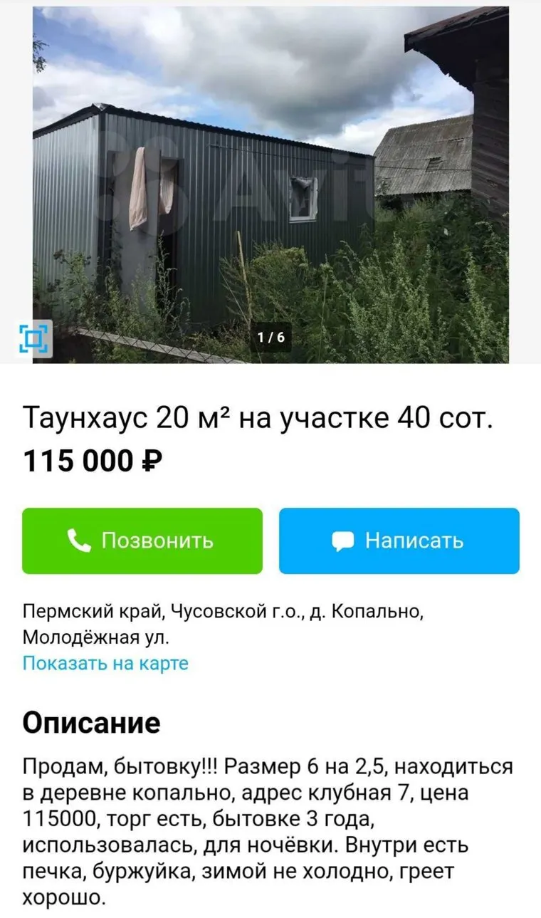 Один из пользователей портала «Авито» в Пермском крае продает бытовку размером 6 на 2,5 метра, называя ее таунхаусом. В других объявлениях на сервисе под видом малоэтажных домов продают деревенские дома и пустующие здания.