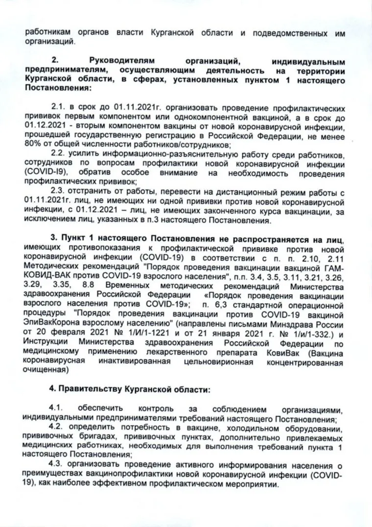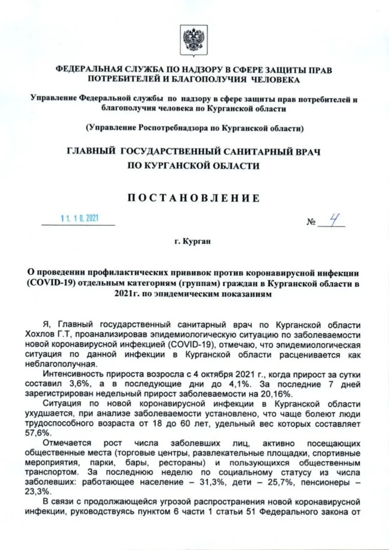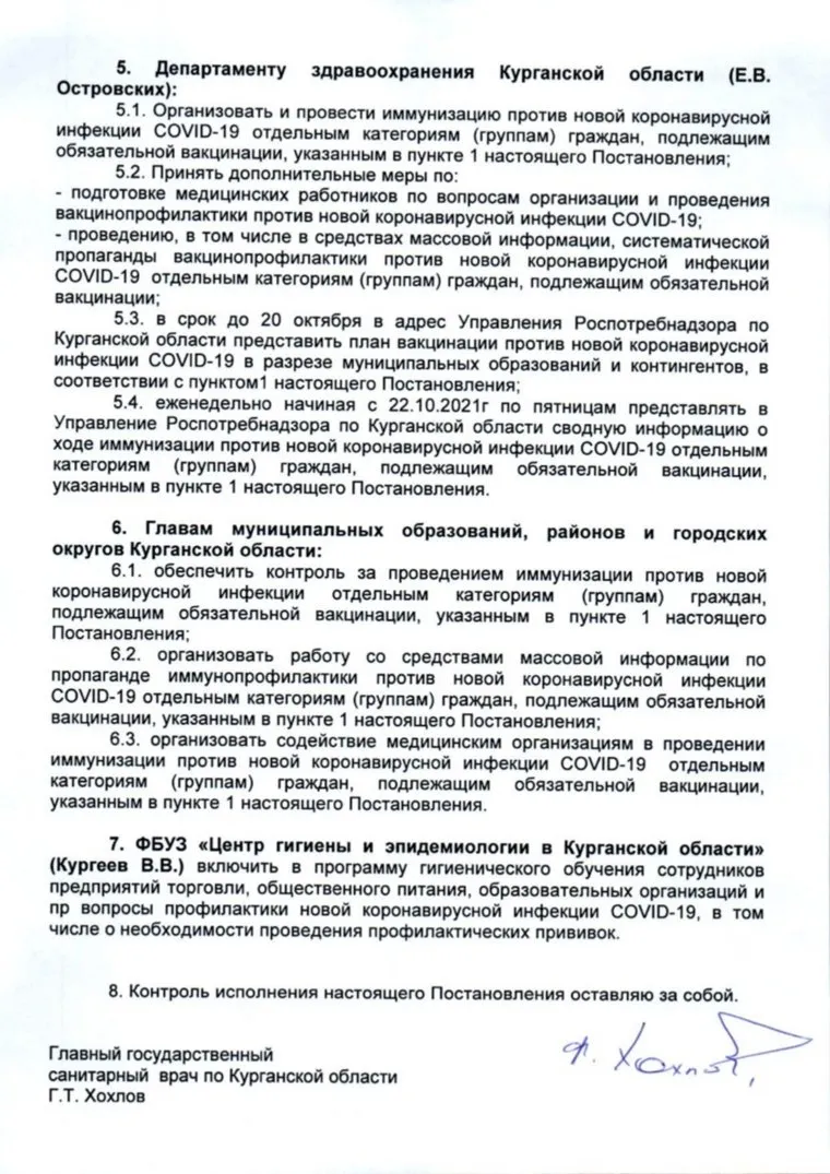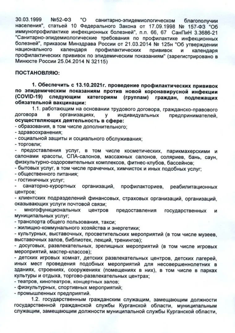 «Обеспечить с 13.10.2021 года проведение профилактических прививок по эпидемическим показаниям против новой коронавирусной инфекции следующим категориям (группам) граждан, подлежащих обязательной вакцинации: 1.1. работающим на основании трудового договора, гражданско-правового договора в организациях, у индивидуальных предпринимателей, осуществляющих деятельность в сфере (далее идет перечисление 19 сфер деятельности). 1.2. государственным гражданским служащим Курганской области, муниципальным служащим, работникам органов власти и подведомственных им организаций», — указано в документе.