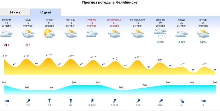 С 12 октября на Южном Урале завершатся ранее обещанные синоптиками дожди, переходящие в мокрый снег, и температура поднимется до 12 градусов. Далее на протяжении всей недели столбик термометра днем будет колебаться в пределах 10-13 градусов. Относительно тепло для октября будет и ночами, ни разу температура не опустится ниже 3-6 градусов.