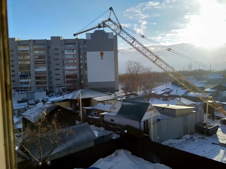 В Кургане кран работает над территорией домов, где живут и ходят люди