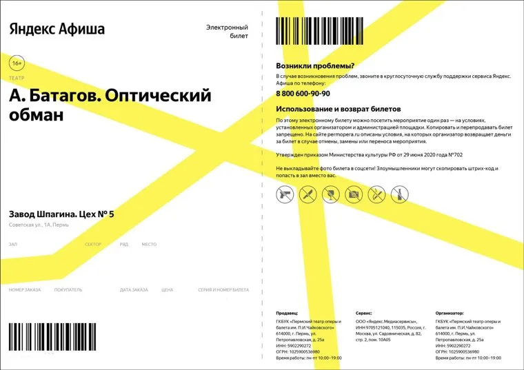 - Не покупать билеты кроме как в кассе по адресу ул. Петропавловская, 25/1, на сайте театра, у распространителей билетов, список которых есть на сайте театра, городских зрелищных кассах (адреса есть также на сайте кассы), на сервисе «Яндекс.Афиша» или на сайте kassy.ru.