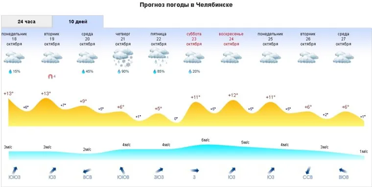 Относительно теплое начало недели, когда 18, 19 и 20 октября температура днем будет держаться в пределах 11-13 градусов, сменится ощутимым похолоданием 20 октября. В четверг столбик термометра упадет уже до шести градусов, при этом ожидается снег с дождем.