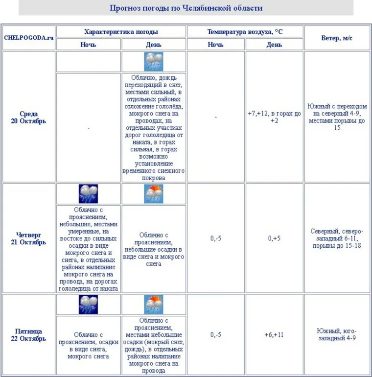«Во второй половине дня 20 октября и ночью 21 октября в отдельных районах Челябинской области ожидаются сильные и очень сильные осадки в виде дождя, переходящего в снег. Также прогнозируется сильное отложение гололеда и мокрого снега на провода, на отдельных участках дорог гололедица, в горах сильная. В отдельных районах области может временно установиться снежный покров», — пояснили URA.RU в региональном ЦГМС.