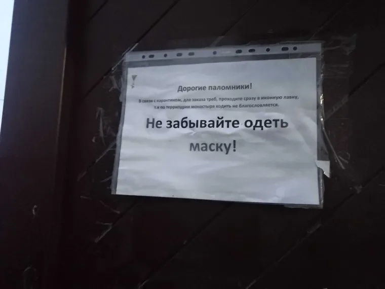 На входе посетителей встречает объявление о карантине и масочном режиме. За воротами есть сторожка, в ней за порядком наблюдает одна из послушниц. Надеть маску журналистов не попросили, но девушке выдали юбку на завязках, чтобы она могла посетить службу. По словам смотрительницы, накануне в монастырь приезжали следователи