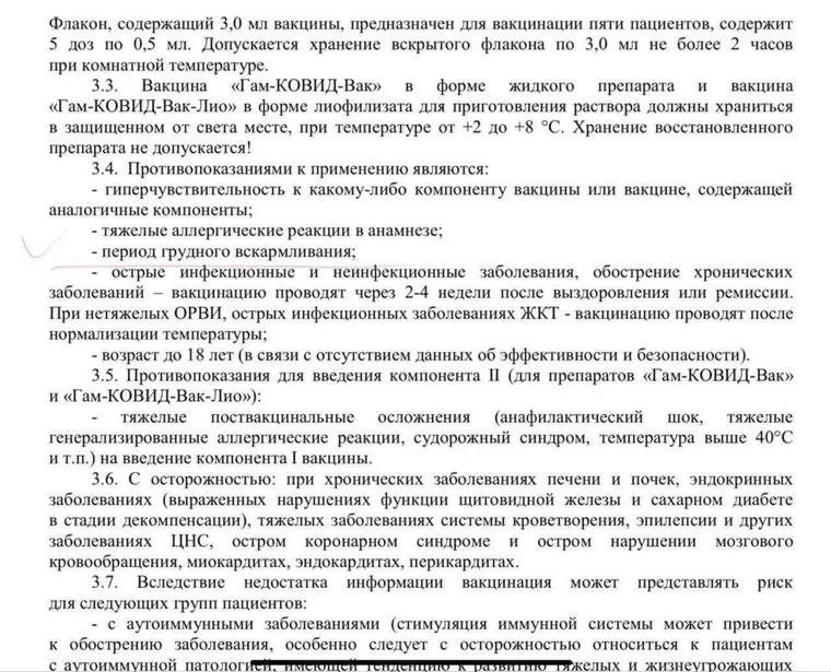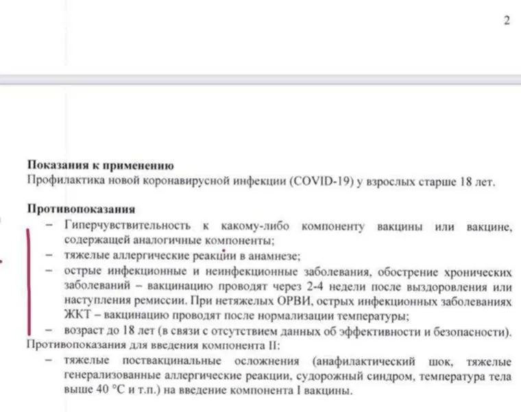 В список противопоказаний в настоящий момент входят люди с гиперчувствительностью к компоненту вакцины, с тяжелыми аллергическими реакциями в прошлом, с острыми хроническими заболеваниями, молодые люди до 18-ти лет, а также те, у кого возникли тяжелые поствакцинальные осложнения. «В предыдущей версии в числе противопоказаний был период грудного вскармливания», — уточнил Токарев. Он также отметил, что данные показания касаются только вакцины «Спутник V».