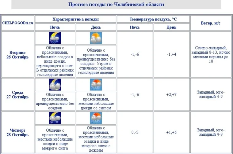 «В ночь на 26 октября будет облачно с прояснениями. Ожидаются небольшие осадки в виде дождя, переходящего в снег. В отдельных районах гололедные явления, которые сохранятся в отдельных районах и днем», — пояснили URA.RU в региональном ЦГМС.