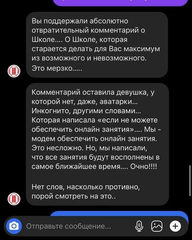 - Счастливый человек, которого пронесло сюда не попасть26 октября 2021 21:58Меня тоже заблокировали в этой школе и выгнала охрана с дня открытых дверей за то что я в их прямом эфире в инстаграме пожаловалась что в пандемию натолкали народу в одну комнатушку так, что там не то что сесть или встать, вообще протолкнуться невозможно было. Мошенники и хабалы. Такого мне потом в Директ написали, на рынке так не разговаривают, как эти ненормальные.