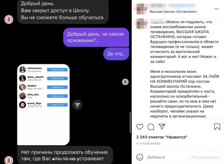 Нескольких студентов «Высшей школы «Останкино» отчислили за лайки комментария с критикой учебного заведения в Instagram (деятельность запрещена в РФ). Об этом URA.RU рассказала студентка Алиса Тимченко, которая попала в число отчисленных.