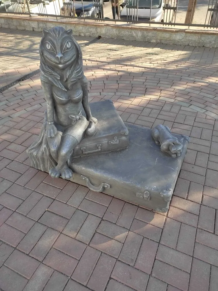 Фотозона «Кошка на чемоданах» появилась возле здания железнодорожного вокзала в октябре. РЖД ее передал местный художник-скульптор. Некоторые горожане раскритиковали внешний вид скульптуры: кошка была изображена с женской грудью. Из-за критики фотозону убрали и не собирались устанавливать ее в других местах. В своем шоу телеведущий Иван Ургант просил не переплавлять скульптуру и оставить в покое . Блогер-урбанист Илья Варламов предположил , что ее могут установить в «менее популярной части города».