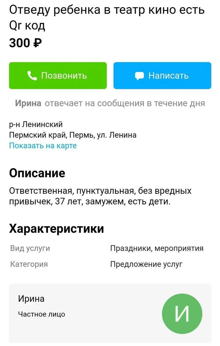 В другом объявлении за отдельную плату предлагается отвести ребенка в театр или кино. Как пишет пермячка в объявлении, у нее имеется действующий QR-код, а себя она описывает как пунктуального, ответственного человека. Стоимость такой услуги — 300 рублей.