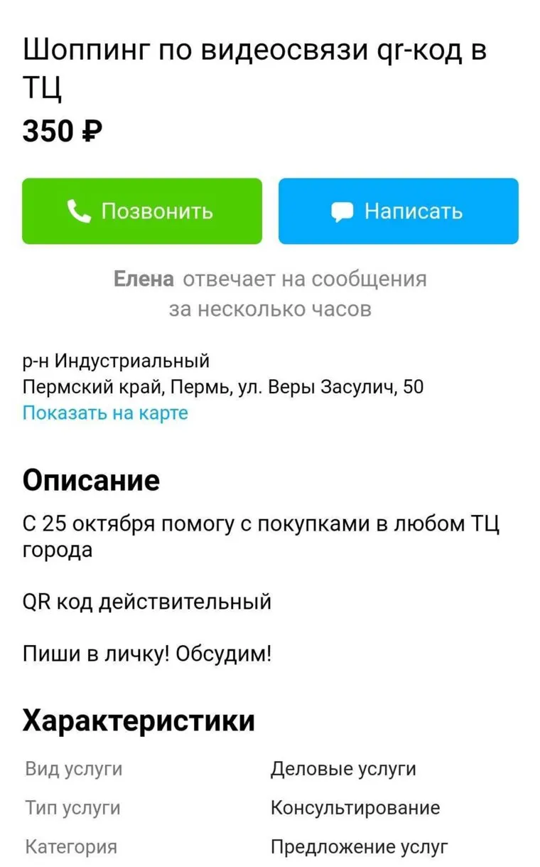 «Шоппинг по видеосвязи, QR-код в ТЦ», — сообщается в одном из объявлений. Автор объявления пишет, что поможет с покупками в любом ТЦ Перми, поскольку имеет действующий QR-код. Стоимость услуги составляет 350 рублей.