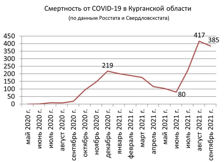 «Сведения о числе зарегистрированных умерших с установленным диагнозом коронавирусной инфекции за сентябрь 2021 года. Курганская область — 385», — указано в отчете Росстата.