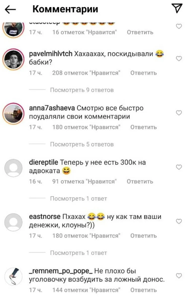 «Пост про изнасилование удален, как будто ничего и не было, 300 тысяч собраны, ждем теперь возбуждения в отношении нее по статье 159 УК РФ „Мошенничество“ и 306 УК РФ „Заведомо ложный донос“», — пишет пользователь под ником alexfunfun. Пользователь под ником eastnorse иронизирует над теми, кто скинул деньги студентке и задается вопросом: «Ну как там ваши денежки, клоуны?». «Я думала человеку нужна помощь, потому что была подписана на нее и скинула ей 7 тысяч с зп, а потом ее везде слили и она всех игнорит… (орфография и пунктуация автора сохранены — прим. ред.)», — сокрушается пользователь под ником nneed_v.