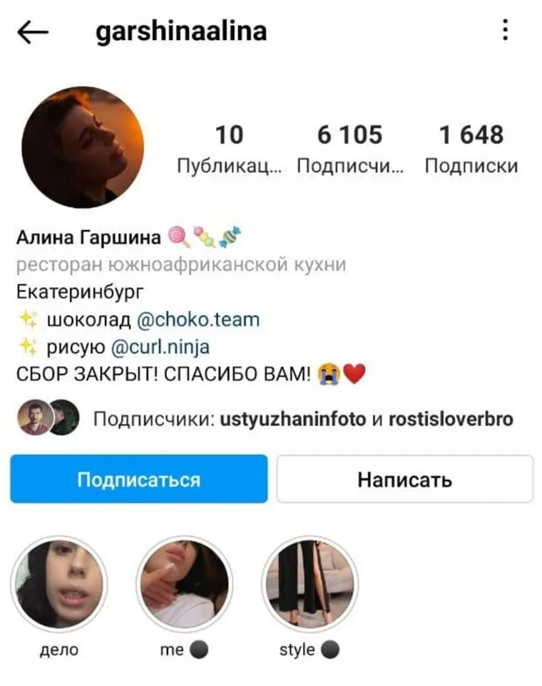 Другие пользователи также пишут о том, что перевели девушке от 10 до 15 тысяч рублей. Многие призывают объединяться и писать на студентку заявление в полицию. Какую сумму успела собрать с подписчиков Алина Гаршина неизвестно, но по сообщениям пользователей Instagram (деятельность запрещена в РФ), ей в общей сложности перевели около 300 тысяч рублей. На запрос корреспондента URA.RU она не ответила. Видео с призывами о сборе средств с подписчиков Гаршина уже удалила со своей страницы, но в шапке ее страницы осталось сообщение, которое гласит: «Сбор закрыт. Спасибо вам!»